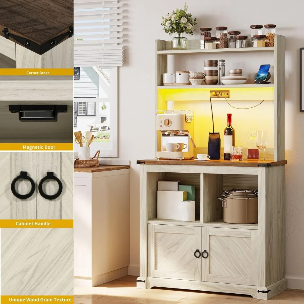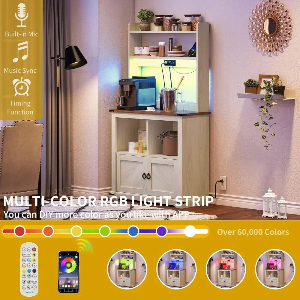 DWVO Kitchen Coffee Bar Cabinet with Storage & LED Lights, Baker Rack with Microwave Stand & Power Outlet, Farmhouse Food Pantry