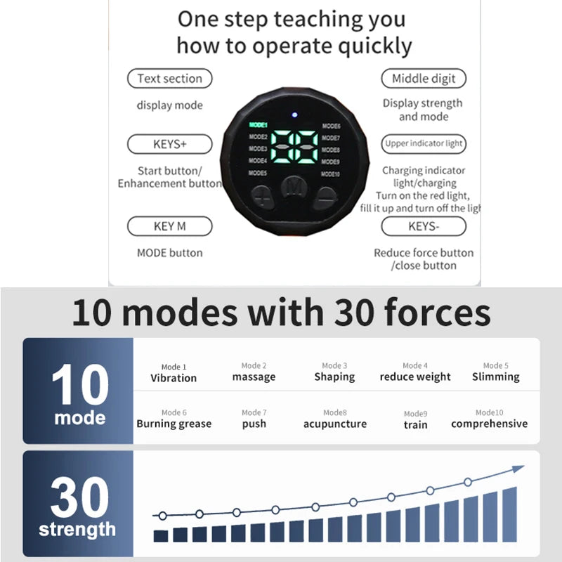 3) Muscle Training: 10 modes, 30 levels of strength, help to regulate, tighten and exercise your body muscles. You can select different mode and intensity respectively to meet your desired muscle training effect.