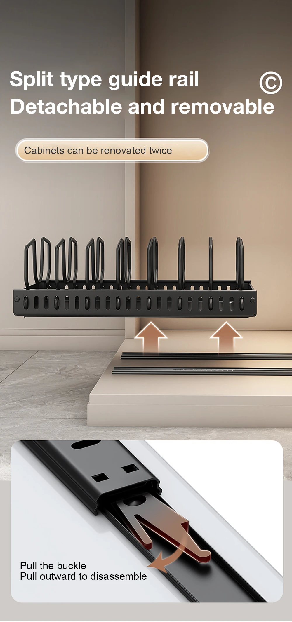 4.This pot rack is designed with sliding rails and built-in pulley balls, with just a gentle pull, you can store or take out your kitchenware, no longer have to squat and search for and organize your kitchenware.
