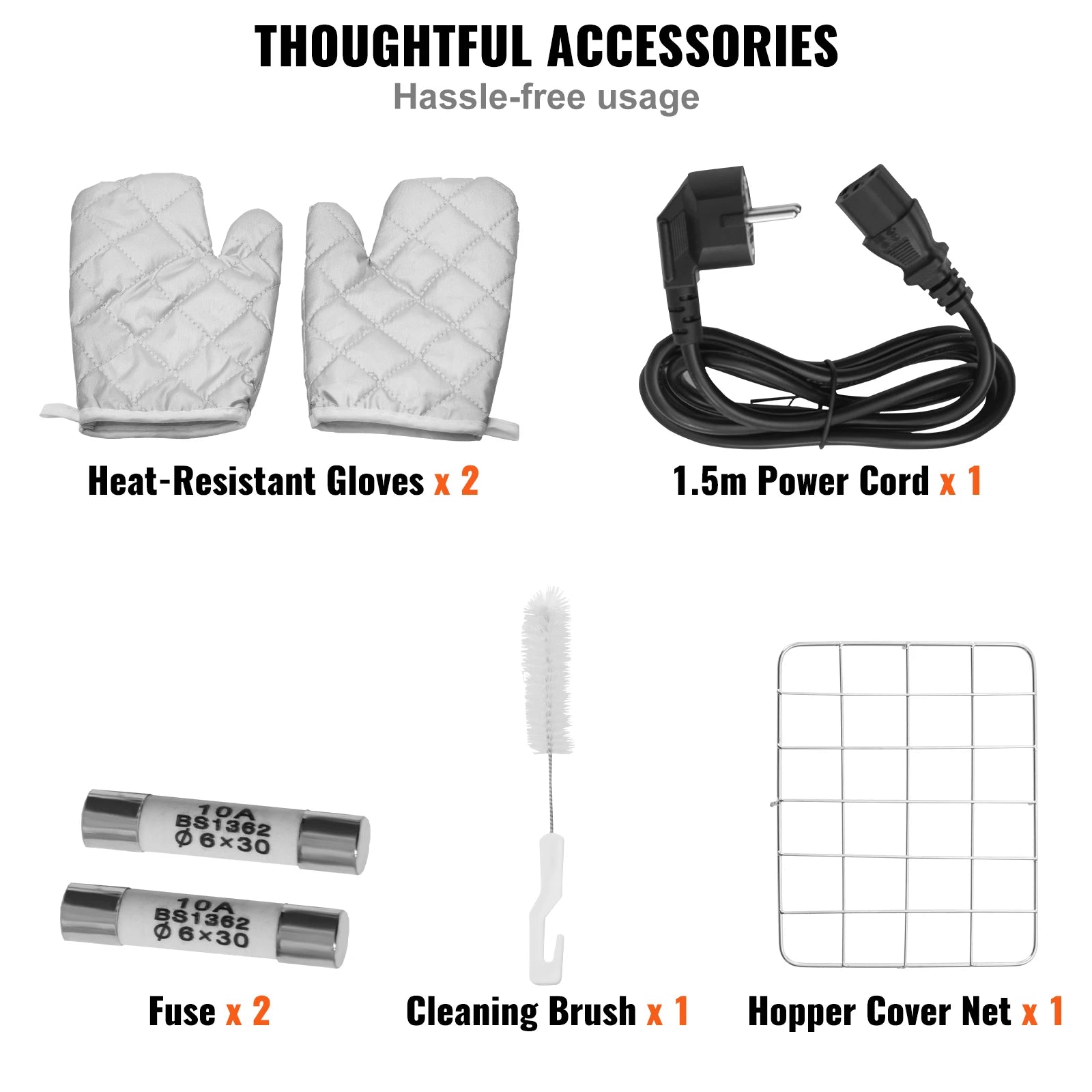 Comes with a 1.5m / 59in power cord, 2 heat-resistant gloves, 2 fuses, and a cleaning brush.